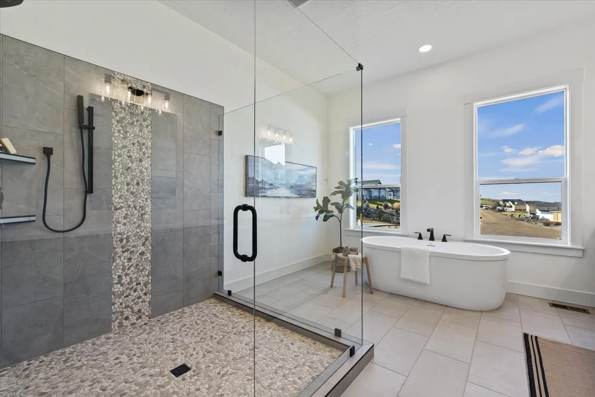 This home features 4 full bathrooms with tile showers, full vanities, & ample cabinet space. The primary bath offers a soaker tub, dual vanity, and large glass-enclosed tiled walk-in shower with dual shower head and built-in storage.